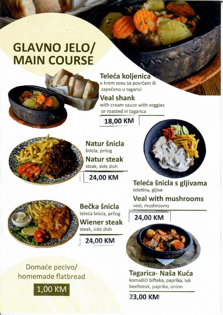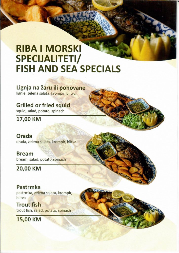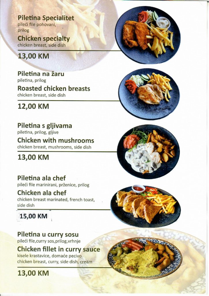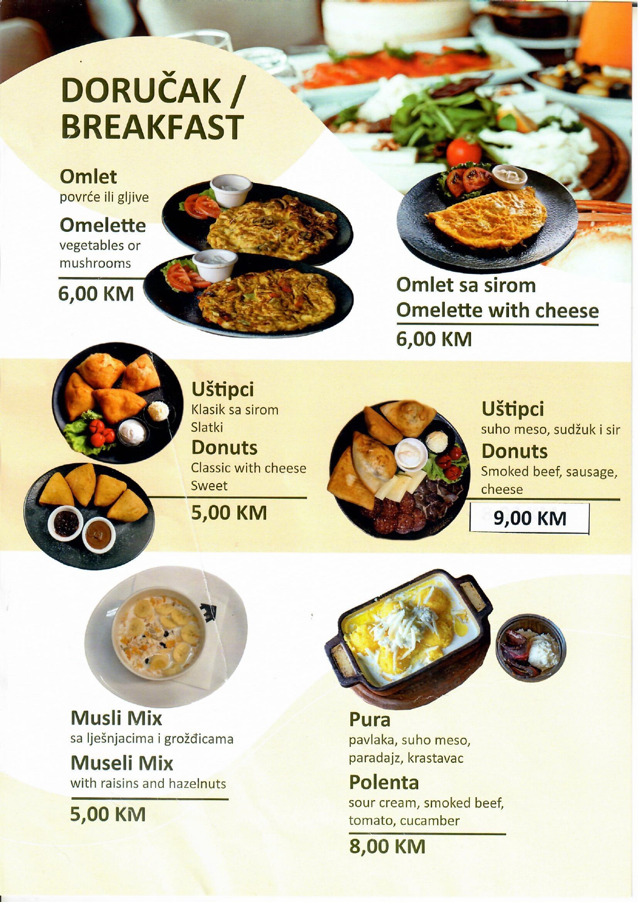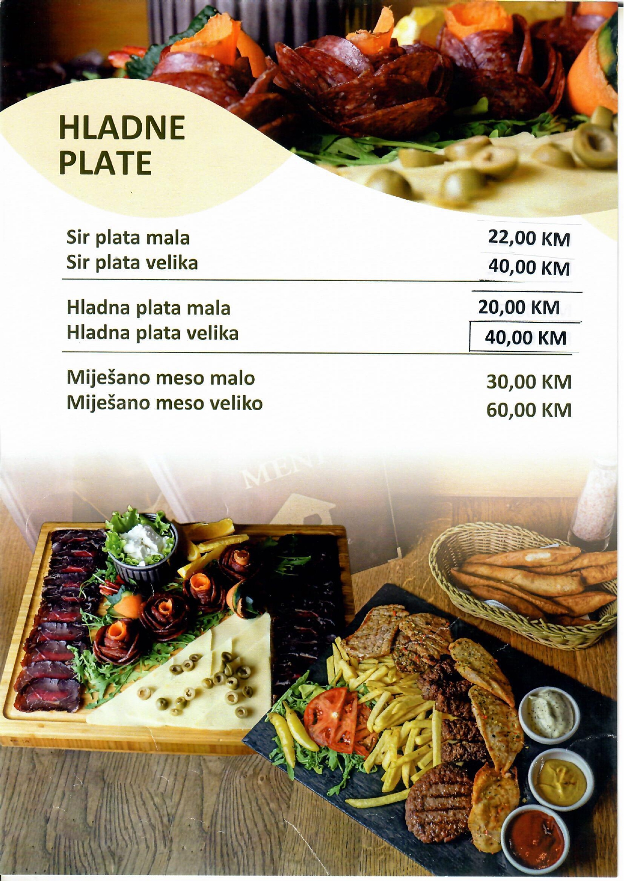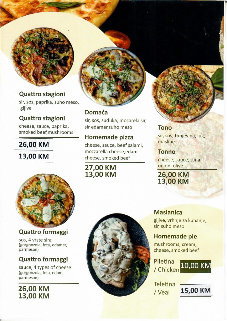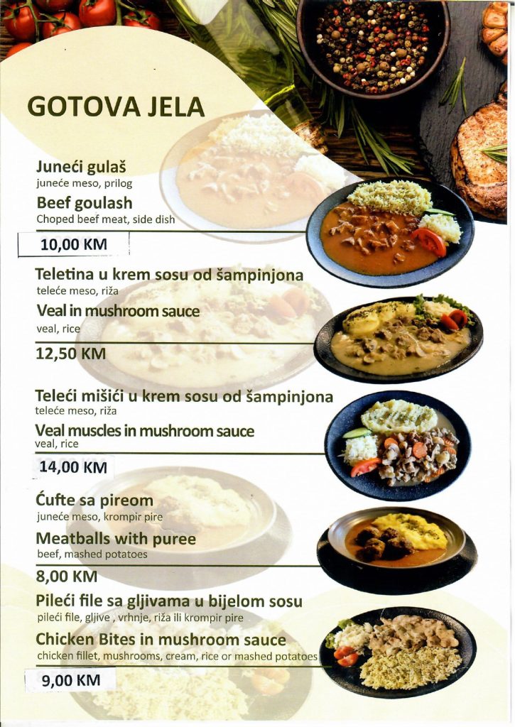 U ponudi se nalaze pažljivo pripremljena predjela, raznovrsne supe i čorbe, bogat izbor glavnih jela od mesa i ribe, kao i svježe salate i domaći prilozi. Posebno mjesto zauzimaju tradicionalna jela pripremljena po provjerenim recepturama, uz korištenje kvalitetnih i svježih namirnica. Za potpuni gastronomski doživljaj, meni uključuje i izbor deserata, toplih i hladnih napitaka, te selekciju domaćih i stranih pića.