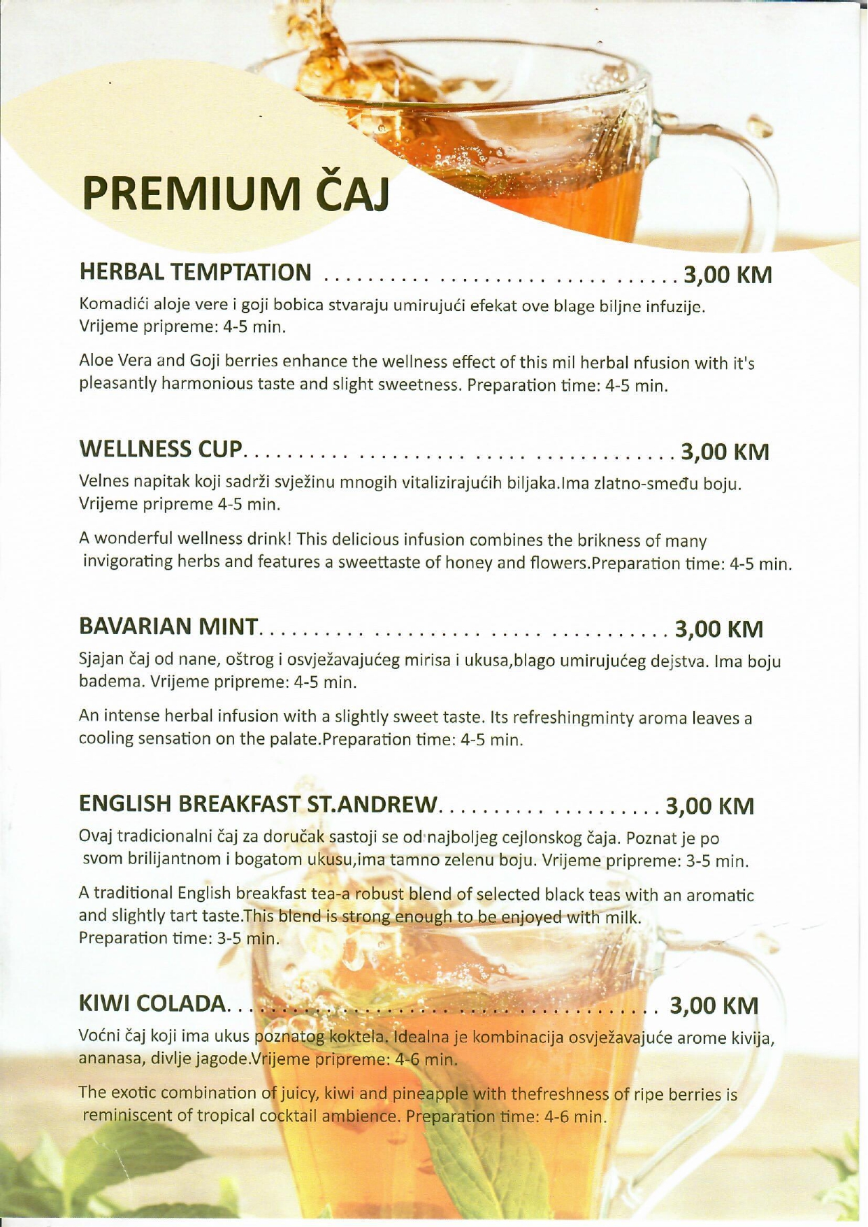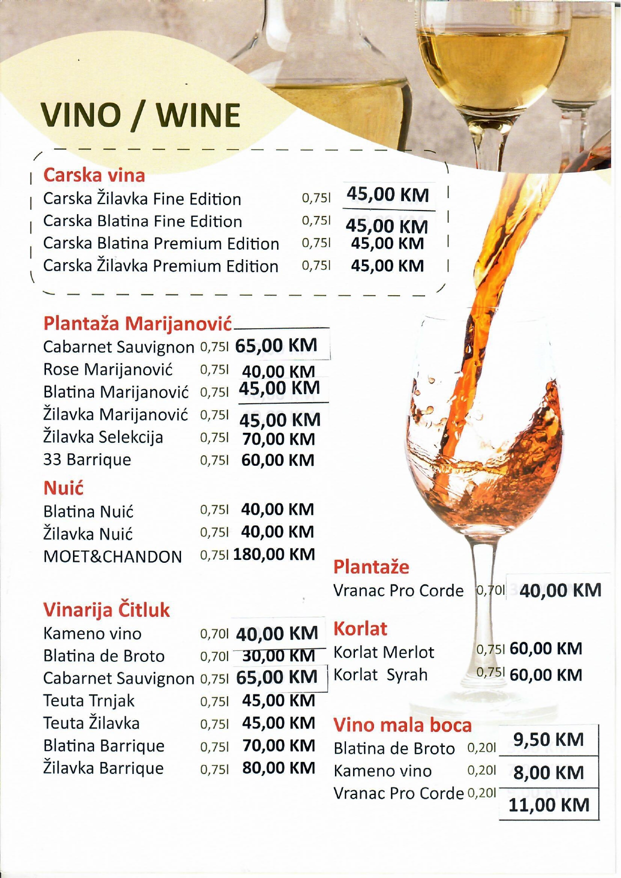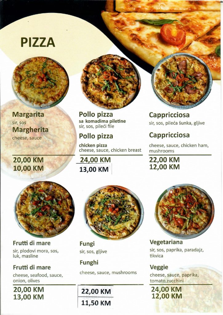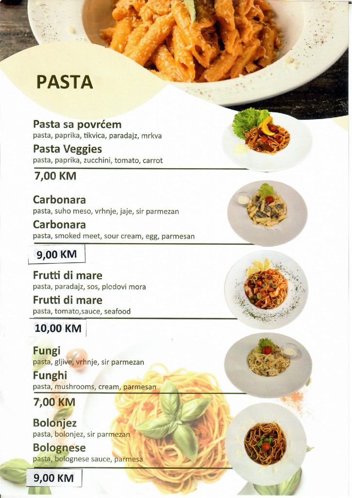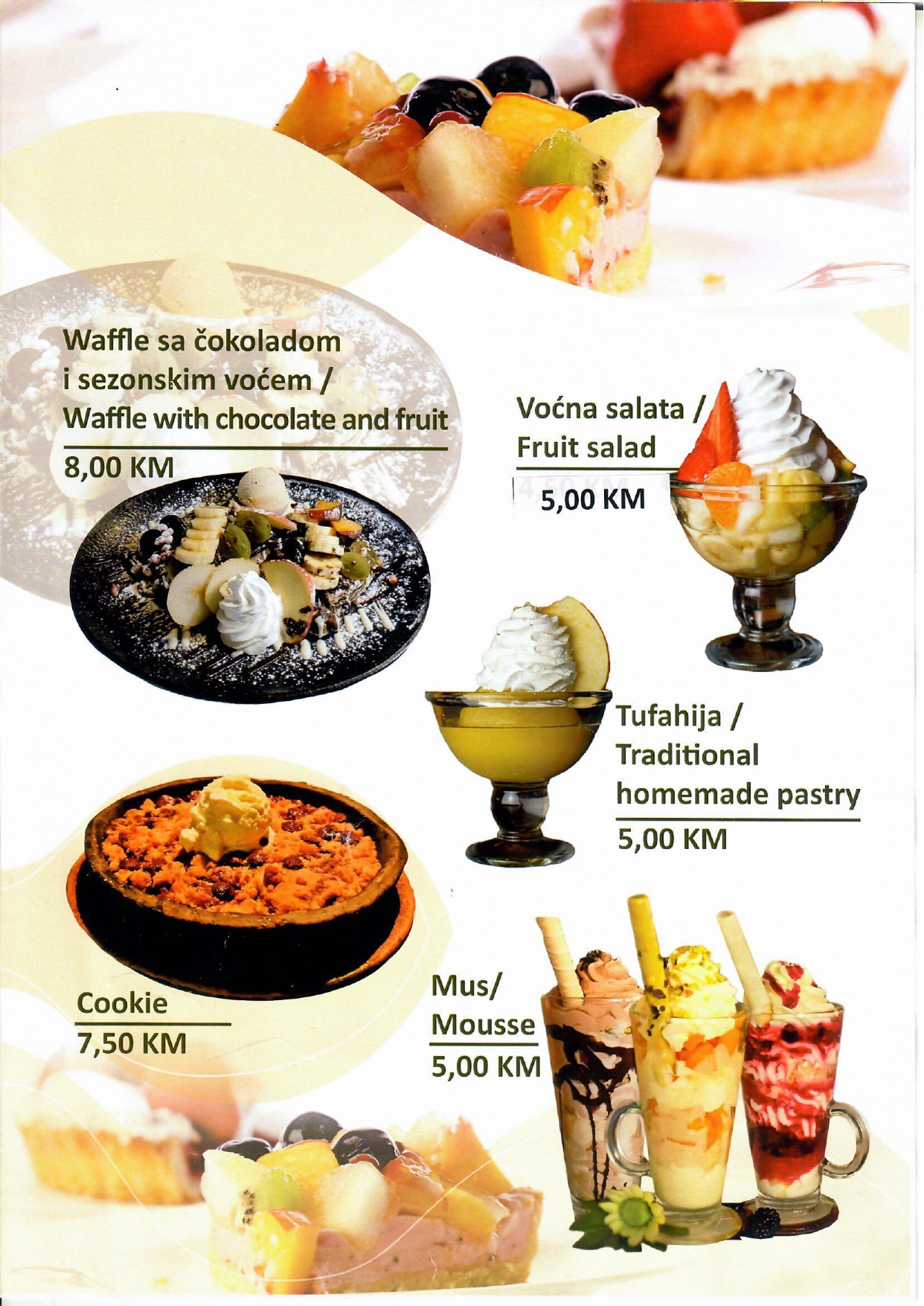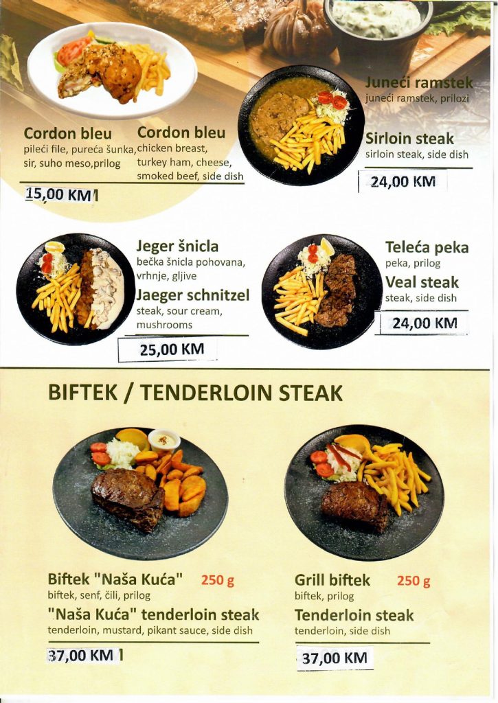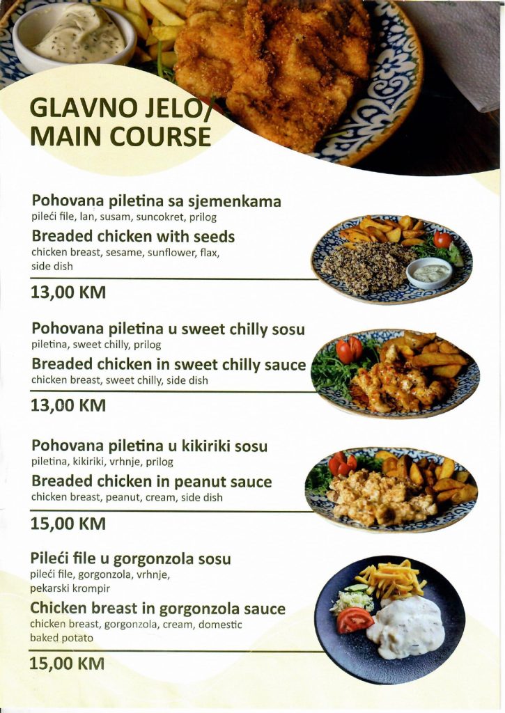 U ponudi se nalaze pažljivo pripremljena predjela, raznovrsne supe i čorbe, bogat izbor glavnih jela od mesa i ribe, kao i svježe salate i domaći prilozi. Posebno mjesto zauzimaju tradicionalna jela pripremljena po provjerenim recepturama, uz korištenje kvalitetnih i svježih namirnica. Za potpuni gastronomski doživljaj, meni uključuje i izbor deserata, toplih i hladnih napitaka, te selekciju domaćih i stranih pića.