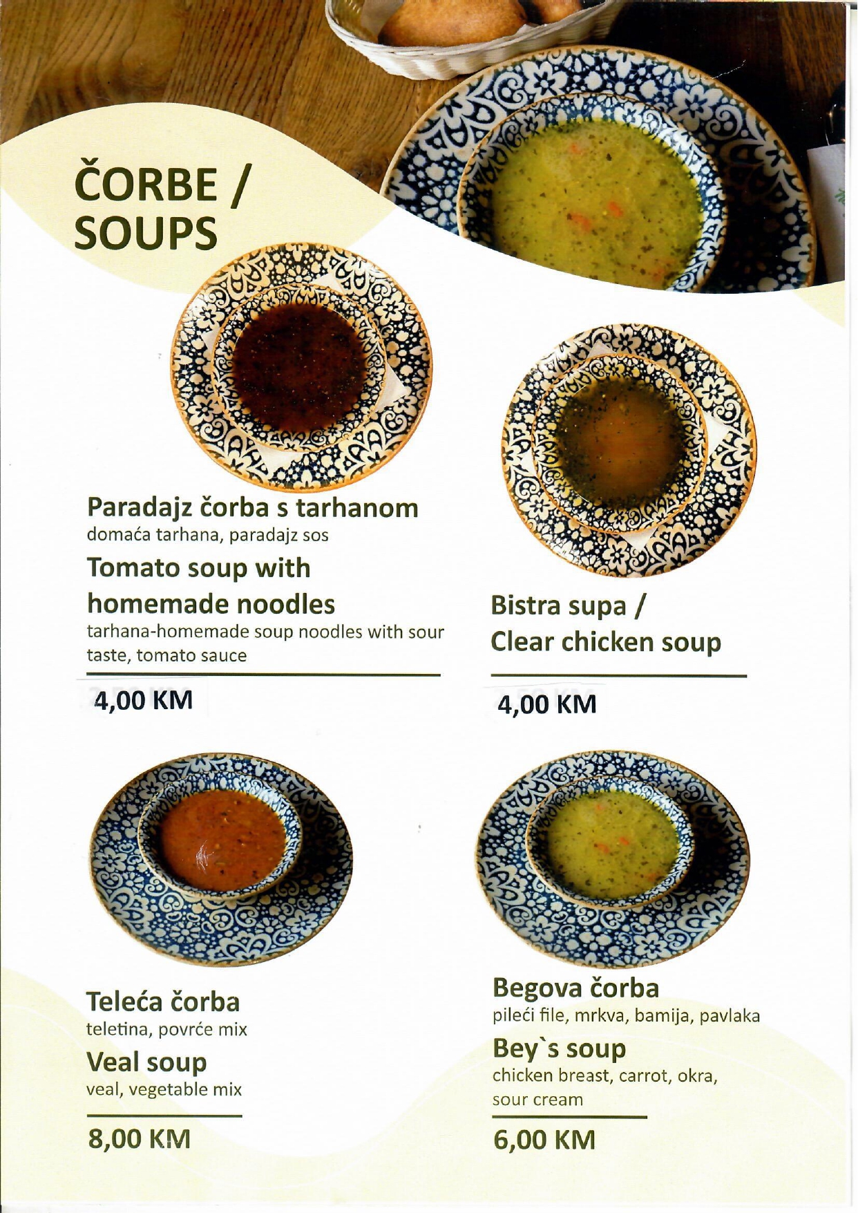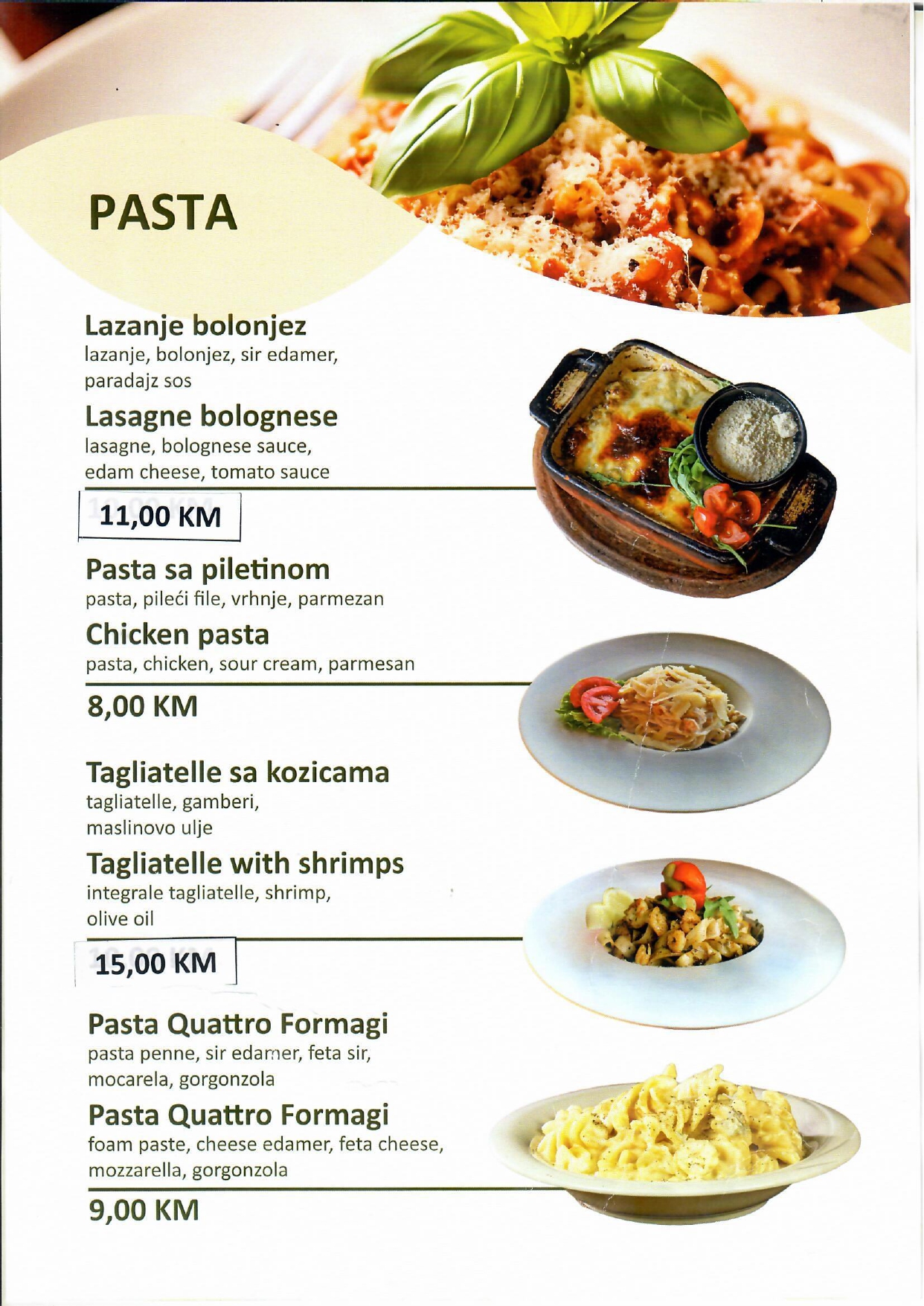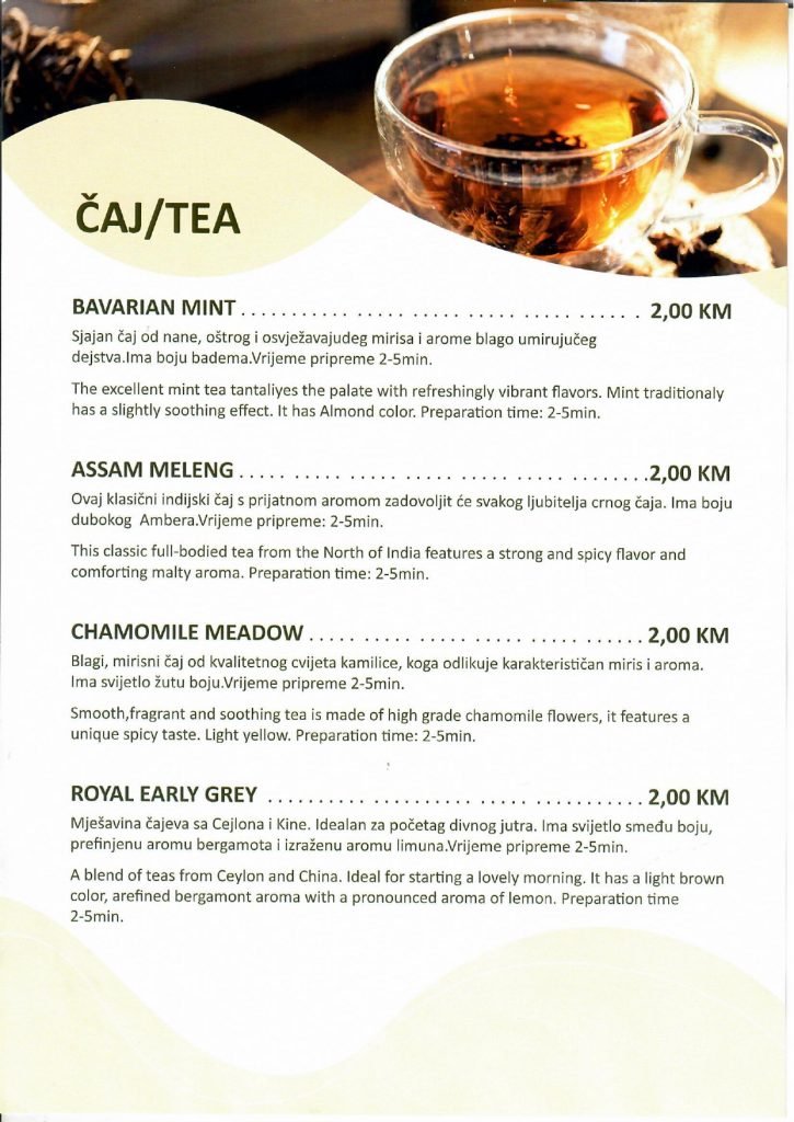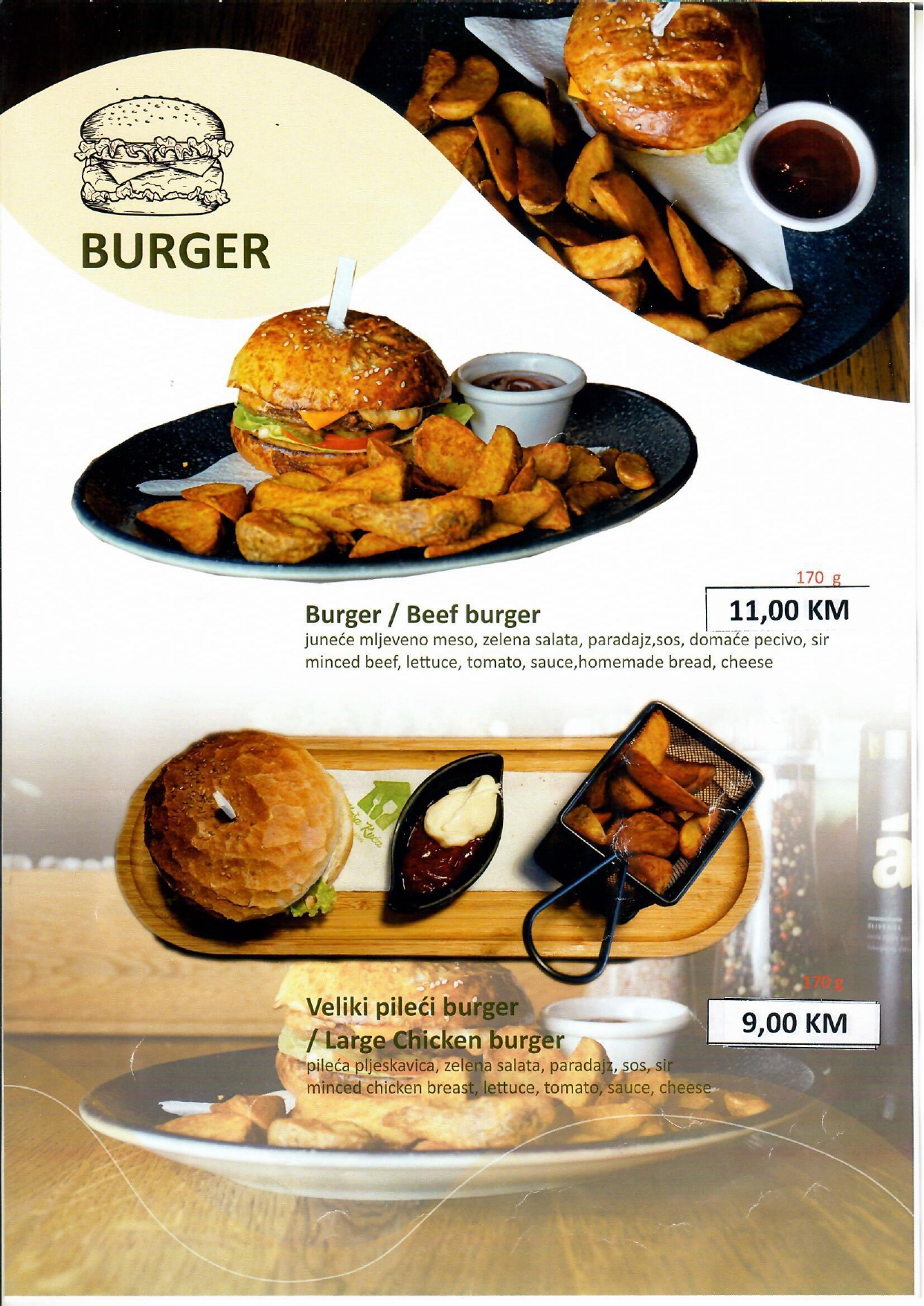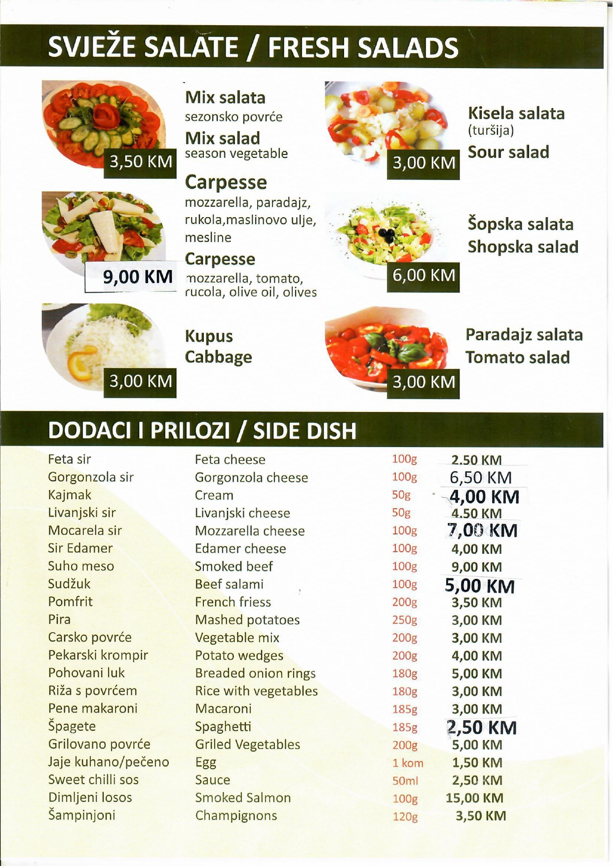 U ponudi se nalaze pažljivo pripremljena predjela, raznovrsne supe i čorbe, bogat izbor glavnih jela od mesa i ribe, kao i svježe salate i domaći prilozi. Posebno mjesto zauzimaju tradicionalna jela pripremljena po provjerenim recepturama, uz korištenje kvalitetnih i svježih namirnica. Za potpuni gastronomski doživljaj, meni uključuje i izbor deserata, toplih i hladnih napitaka, te selekciju domaćih i stranih pića.