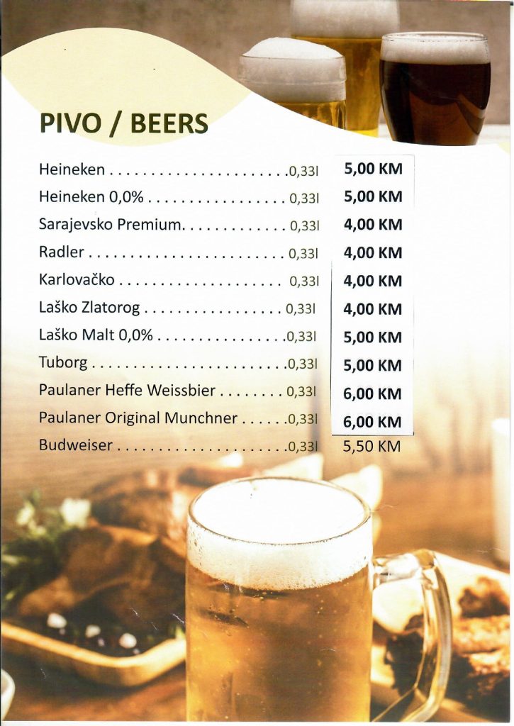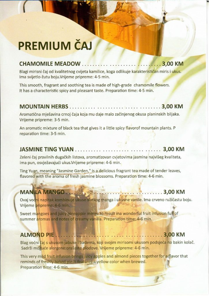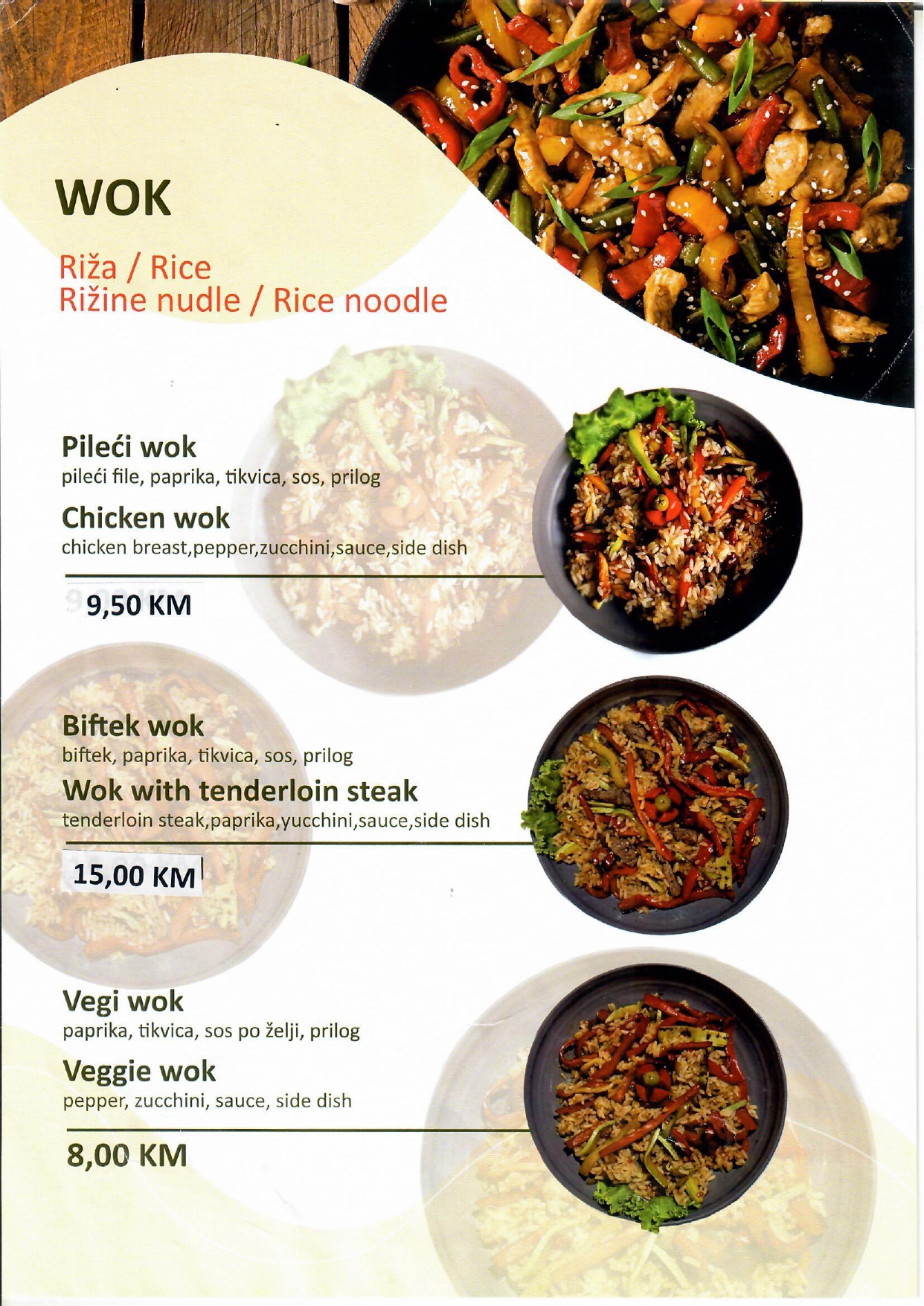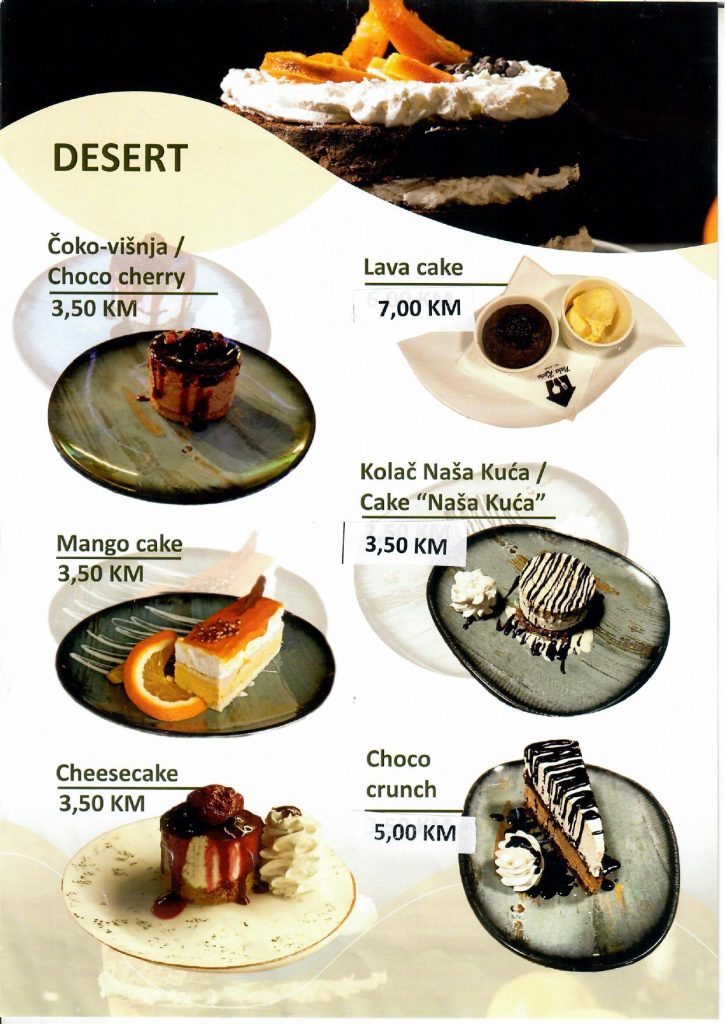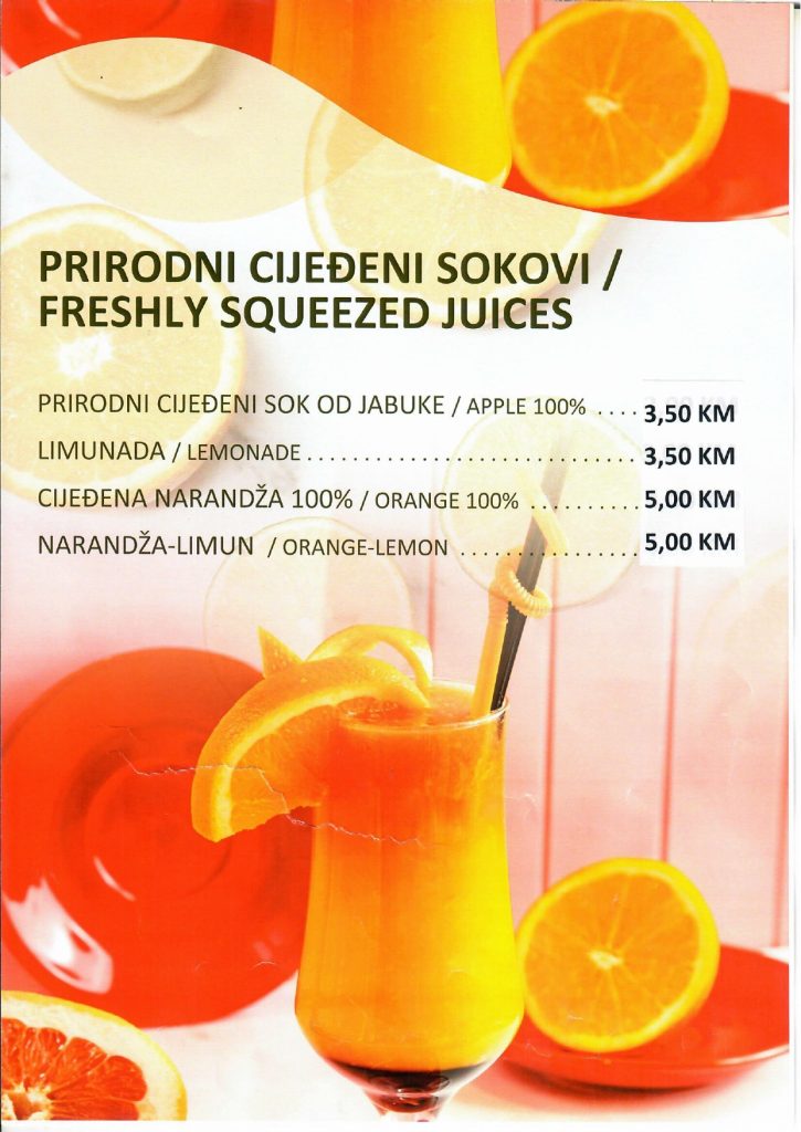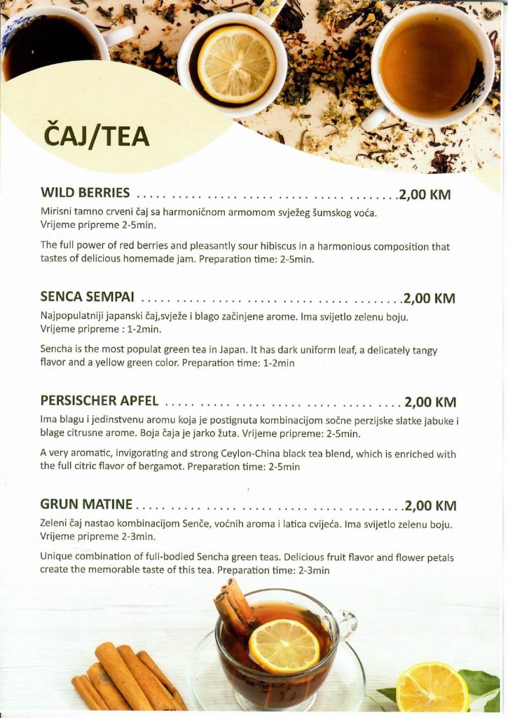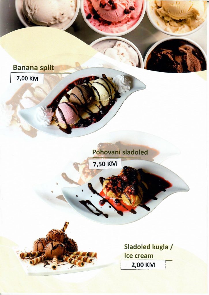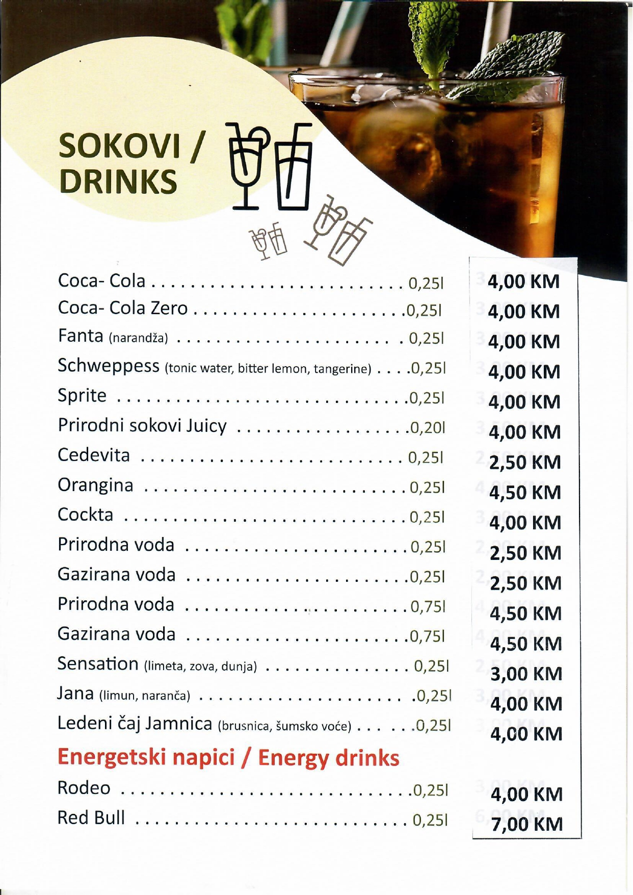 U ponudi se nalaze pažljivo pripremljena predjela, raznovrsne supe i čorbe, bogat izbor glavnih jela od mesa i ribe, kao i svježe salate i domaći prilozi. Posebno mjesto zauzimaju tradicionalna jela pripremljena po provjerenim recepturama, uz korištenje kvalitetnih i svježih namirnica. Za potpuni gastronomski doživljaj, meni uključuje i izbor deserata, toplih i hladnih napitaka, te selekciju domaćih i stranih pića.
