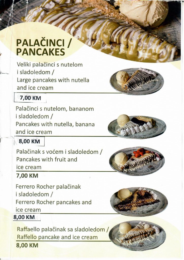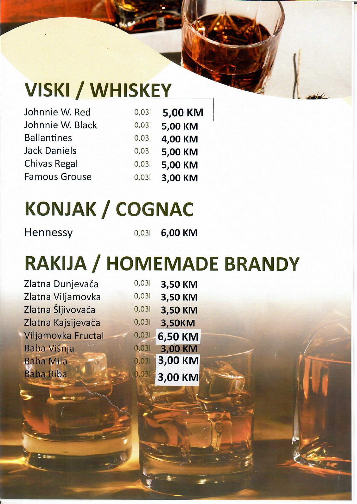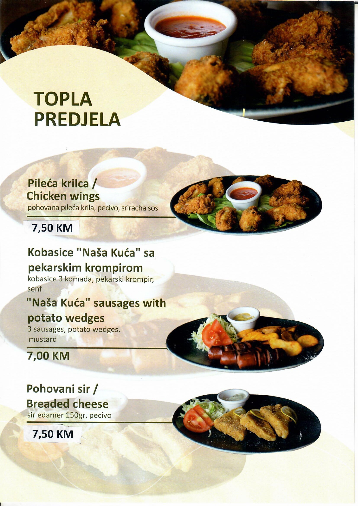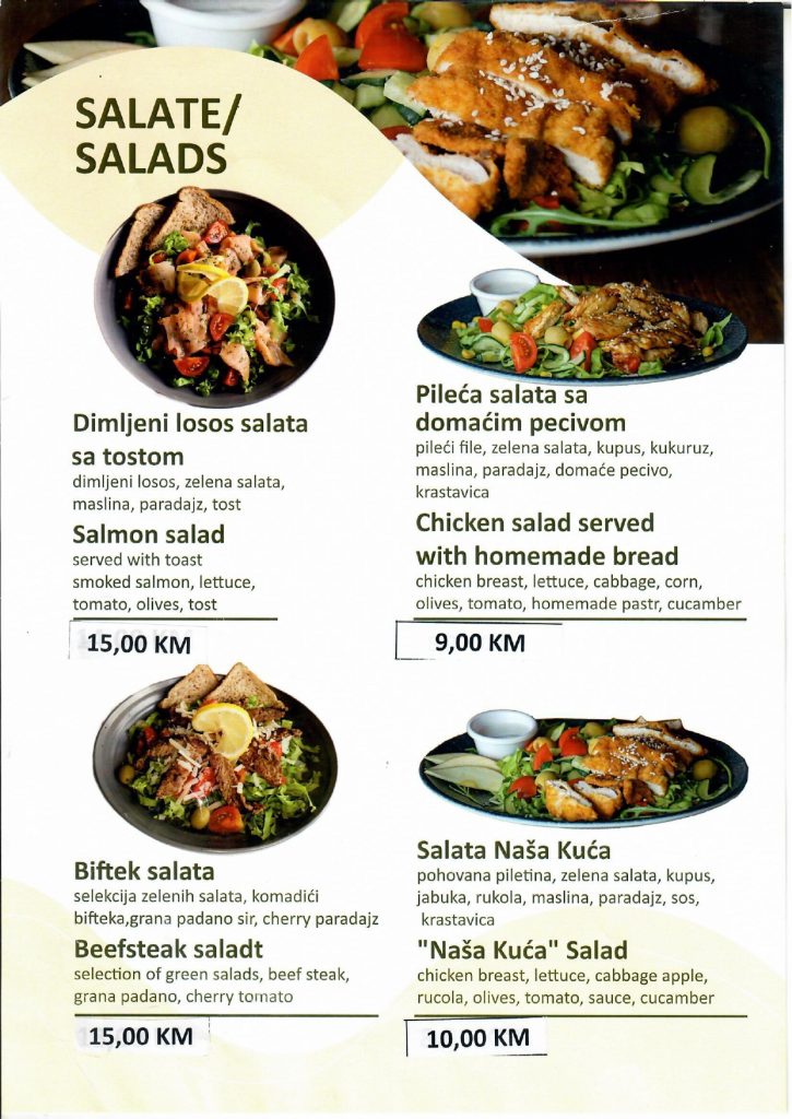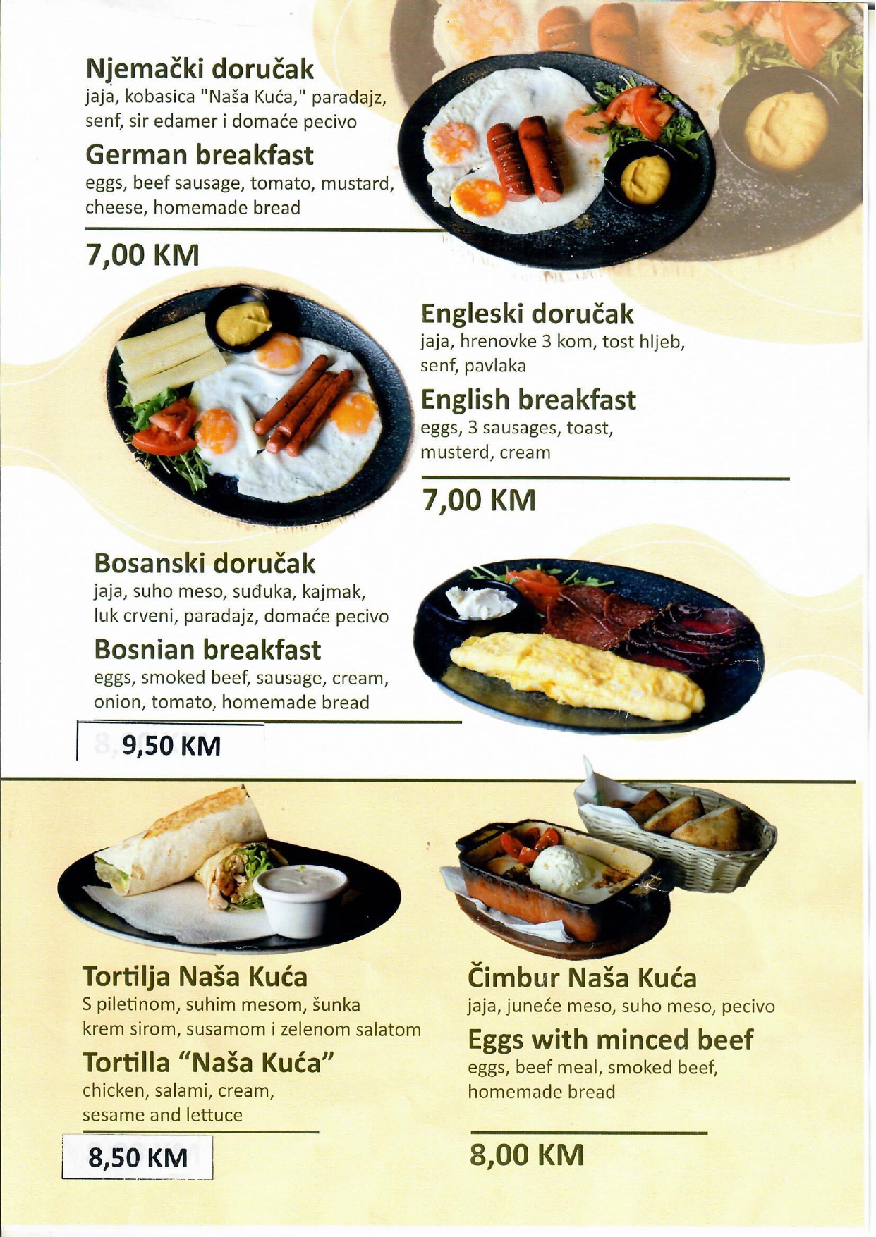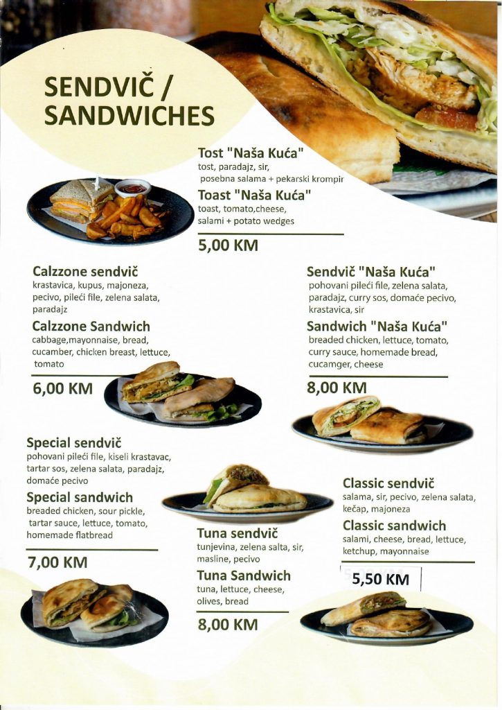 U ponudi se nalaze pažljivo pripremljena predjela, raznovrsne supe i čorbe, bogat izbor glavnih jela od mesa i ribe, kao i svježe salate i domaći prilozi. Posebno mjesto zauzimaju tradicionalna jela pripremljena po provjerenim recepturama, uz korištenje kvalitetnih i svježih namirnica. Za potpuni gastronomski doživljaj, meni uključuje i izbor deserata, toplih i hladnih napitaka, te selekciju domaćih i stranih pića.