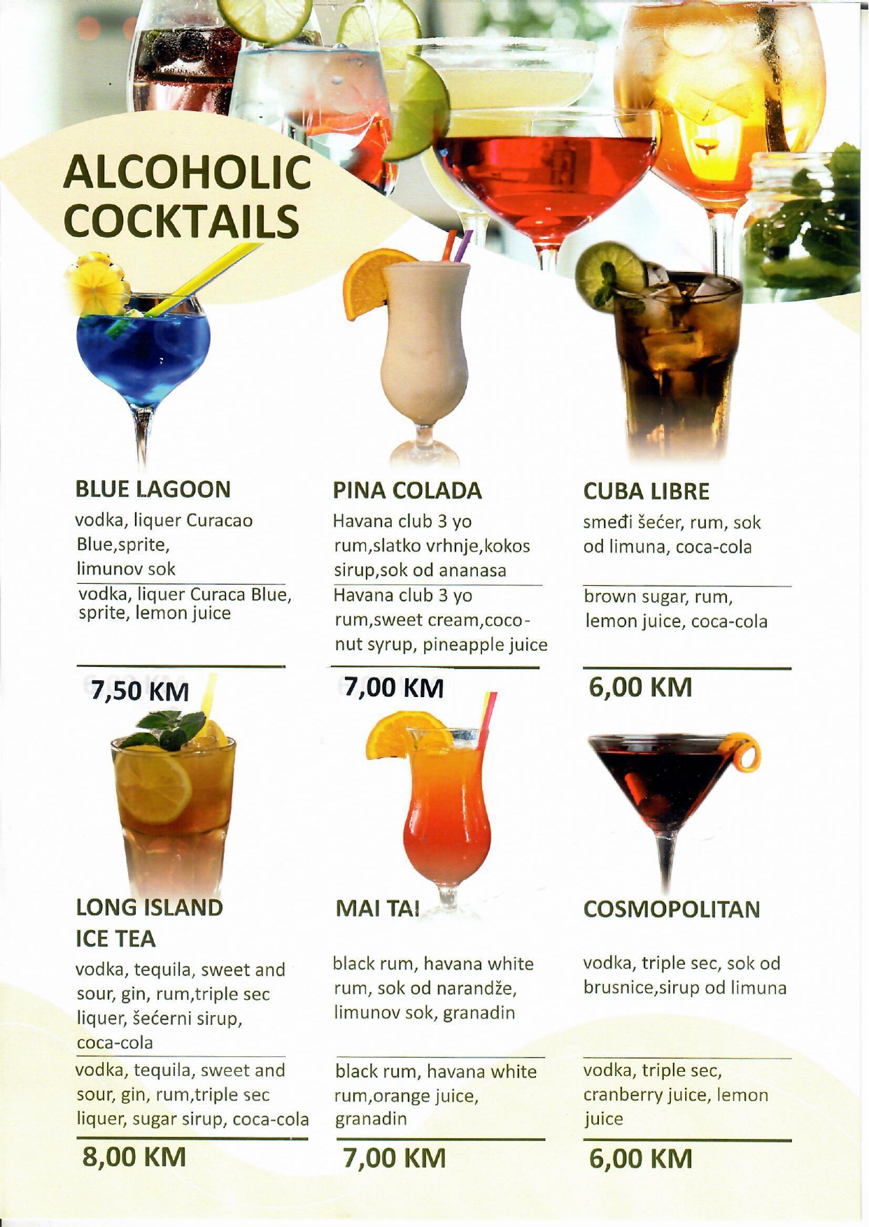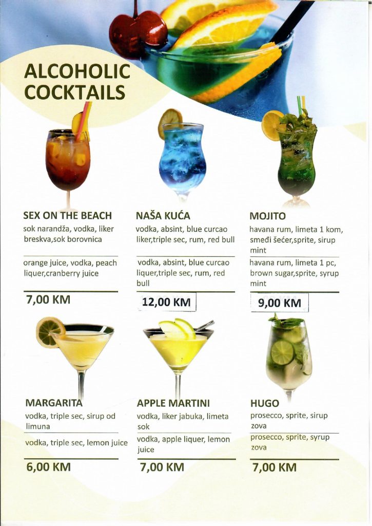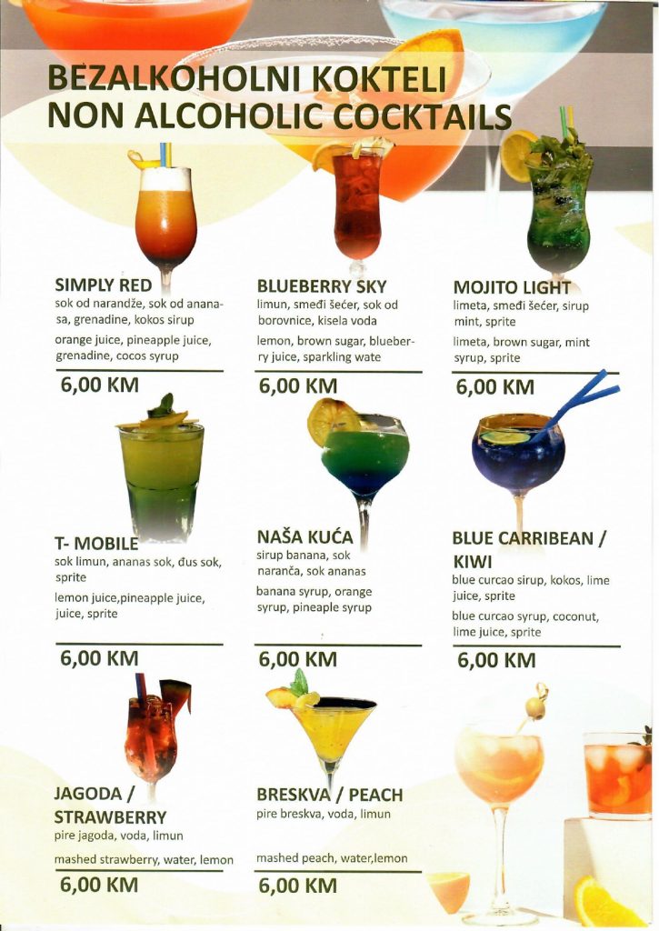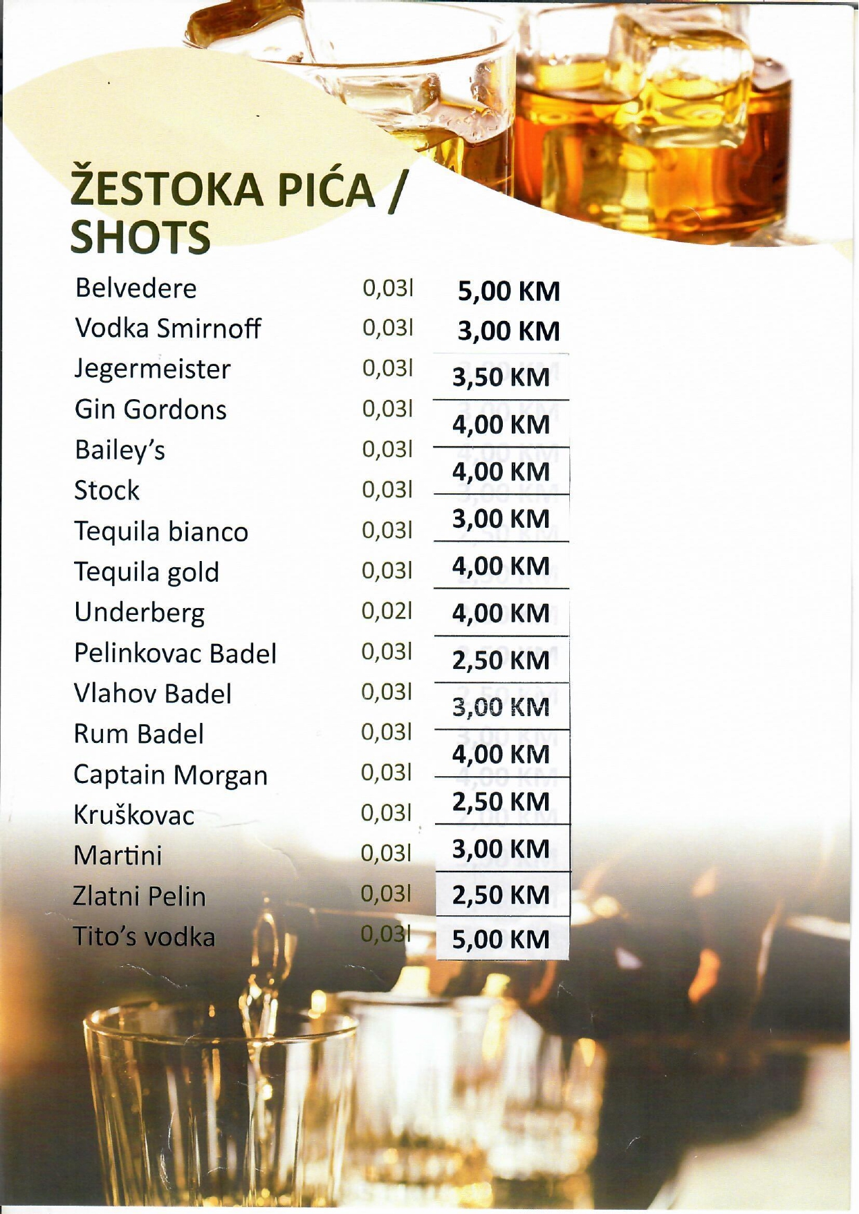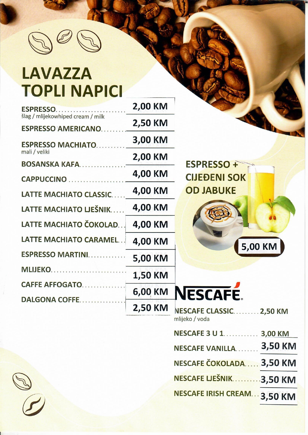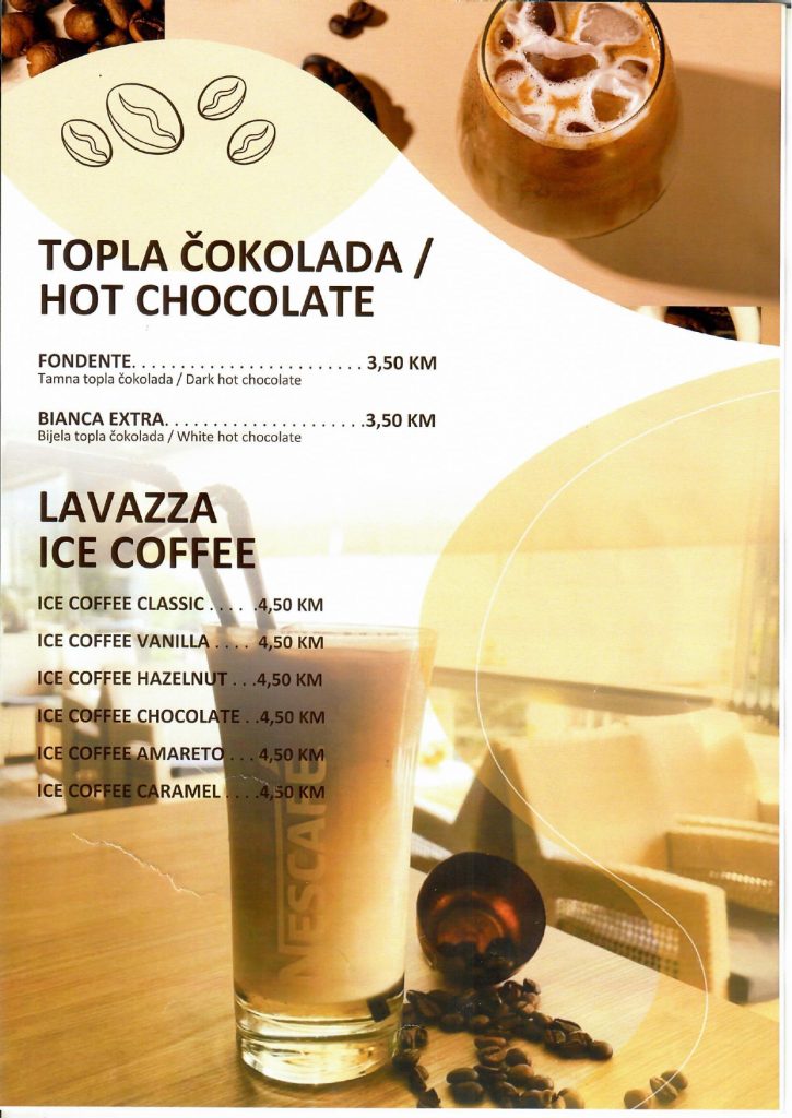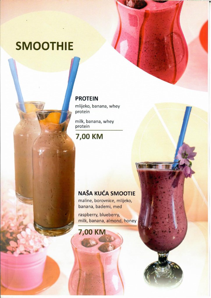 U ponudi se nalaze pažljivo pripremljena predjela, raznovrsne supe i čorbe, bogat izbor glavnih jela od mesa i ribe, kao i svježe salate i domaći prilozi. Posebno mjesto zauzimaju tradicionalna jela pripremljena po provjerenim recepturama, uz korištenje kvalitetnih i svježih namirnica. Za potpuni gastronomski doživljaj, meni uključuje i izbor deserata, toplih i hladnih napitaka, te selekciju domaćih i stranih pića.