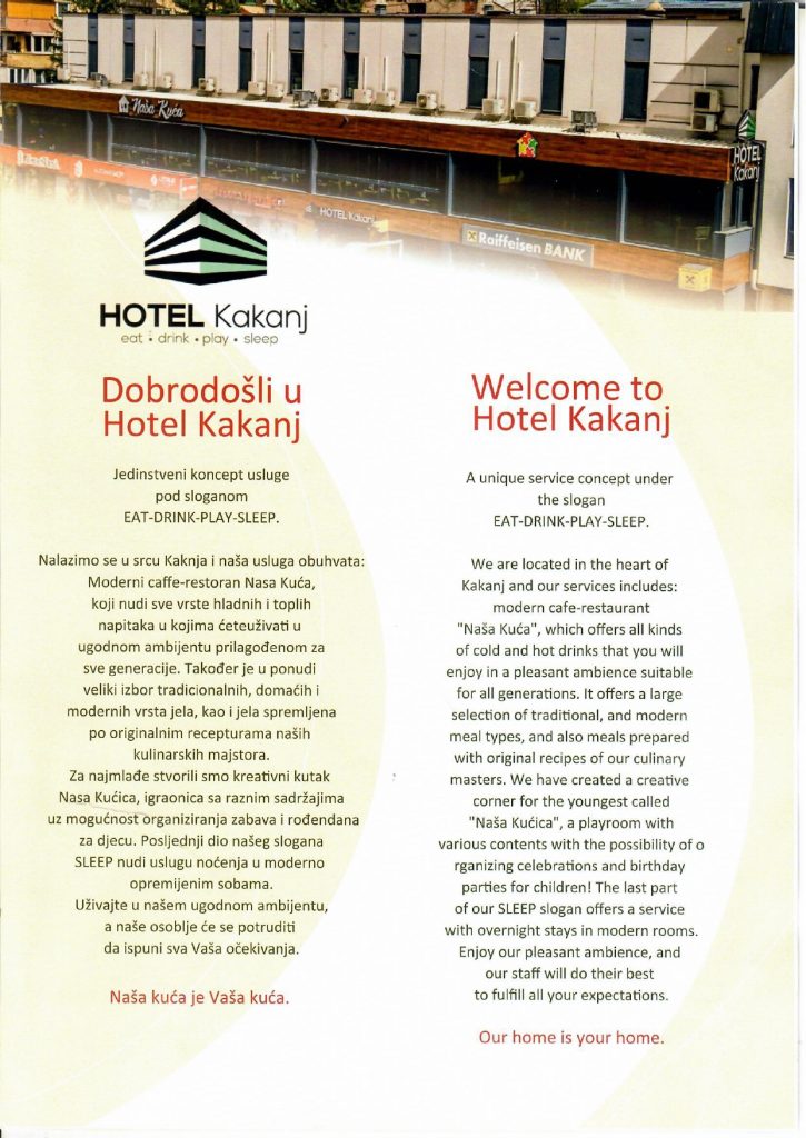 Smješten u samom srcu grada, Hotel Kakanj prepoznatljiv je po spoju tradicionalne bosanske kuhinje i savremenih gastronomskih trendova. Meni hotela osmišljen je tako da zadovolji različite ukuse – od ljubitelja domaćih specijaliteta do gostiju koji preferiraju laganija, internacionalna jela.